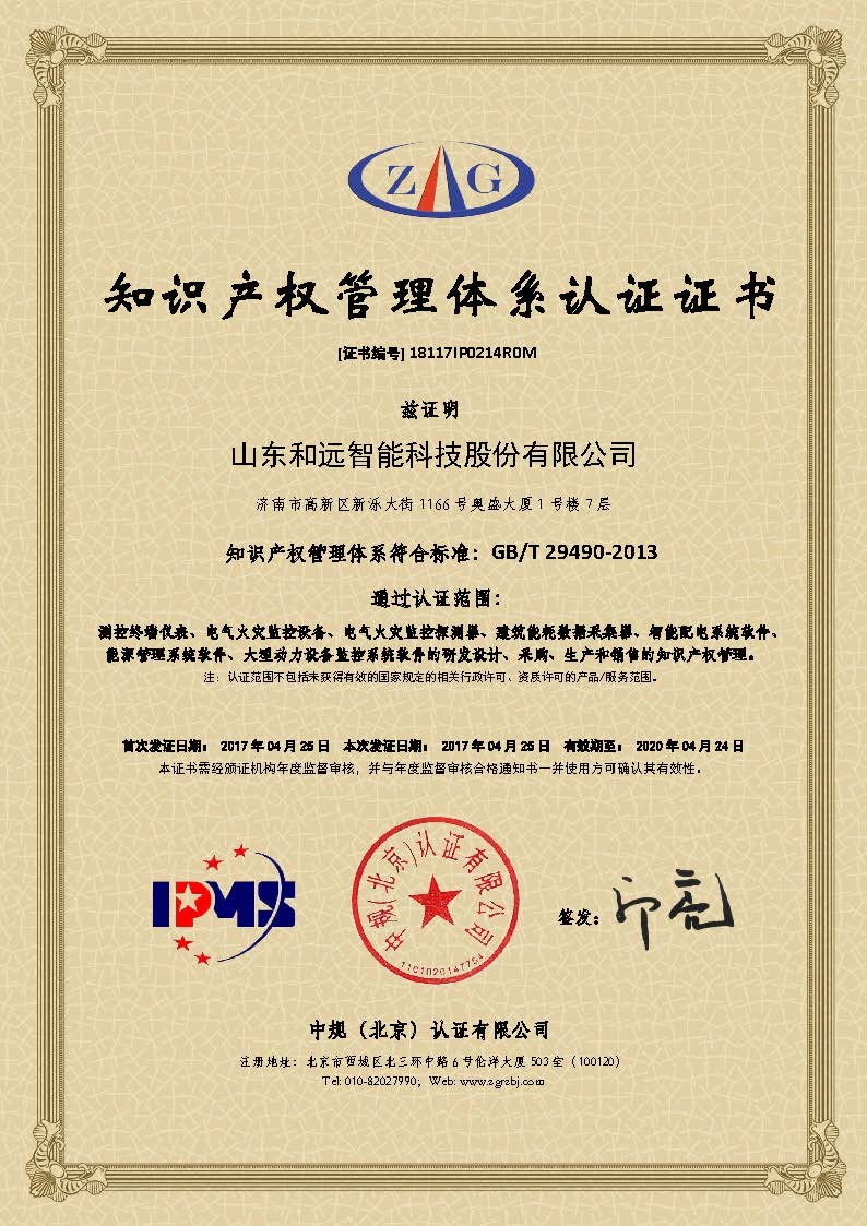 和遠智能嚴格按照GB/T 29490-2013《企業知識產權管理規范》的規定,建立企業知識產權管理標準體系,設置專人負責專利的申報管理工作,從產品研發到推廣過程中的知識產權獲得、保護、實施、激勵進行有效的管理。公司已于2017年4月取得知識產權管理體系認證證書。